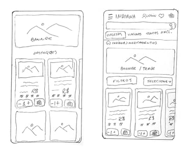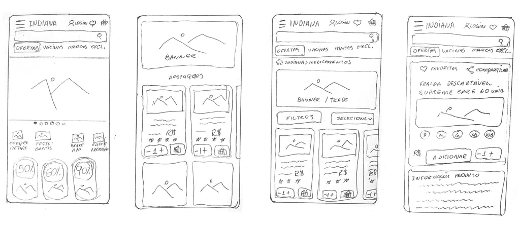 O Rabiscoframe se resumiu em fazer um desenho a mão livre. Inicialmente anotei alguns pontos que considerava importante com base no benchmarking e em seguida desenhei as possíveis telas de forma aleatória, mas que forneceriam uma noção de como seria a solução desenvolvida.