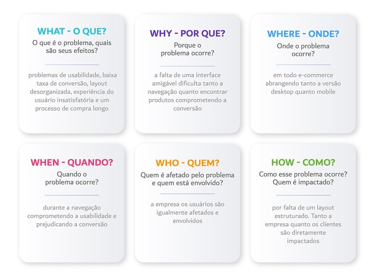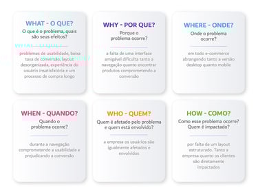 Utilizei esse método para compreender o contexto do problema, o estado atual, fornecendo respostas claras sobre o problema e suas causas.