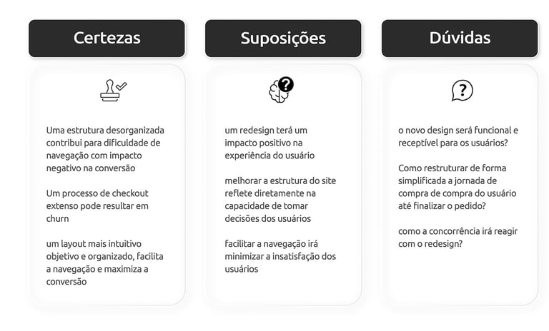 suposição a validar: Melhorar a estrutura do site melhoraria a tomada de decisão durante a jornada de navegação